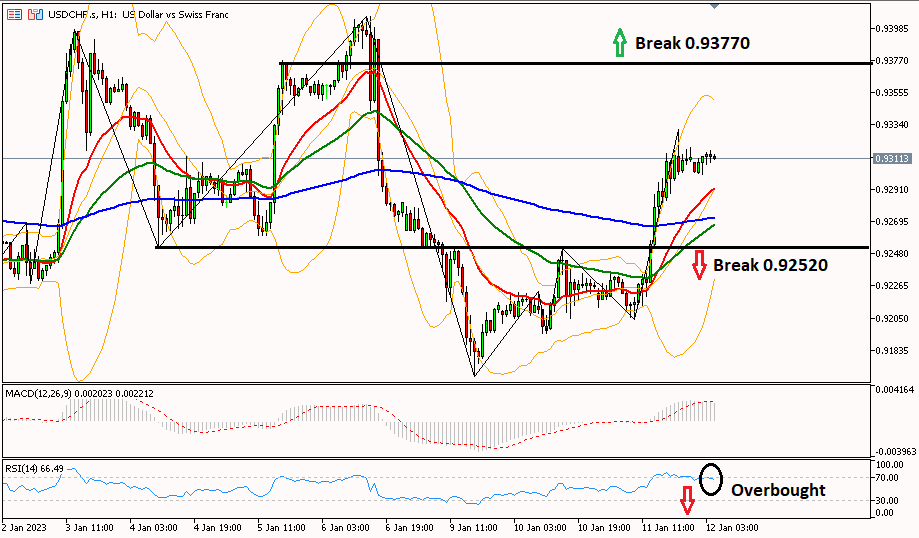 Pasangan USD/CHF mencoba bergerak naik setelah garis MA20 memotong garis MA200 dari bawah di periode 1 jam. Perlu break level 0.93770 untuk melanjutkan kenaikan hingga resistance 0.94570. Namun, indikator RSI yang sudah berada di area overbought, maka franc berpeluang turun. Perlu break area 0.92520 hingga support berikutnya di 0.92030.