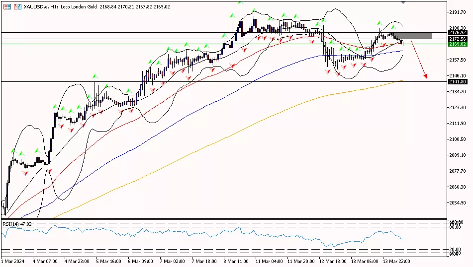 Harga emas pada periode 1 jam berada di bawah area resistance pertama 2178.40, mencoba untuk bergerak turun menuju area pivot di 2154.30 hingga menuju support pertama di 2143.00. Sementara indicator RSI berada di bawah area pivot, sehingga harga emas berpotensi untuk bergerak turun lebih lanjut.