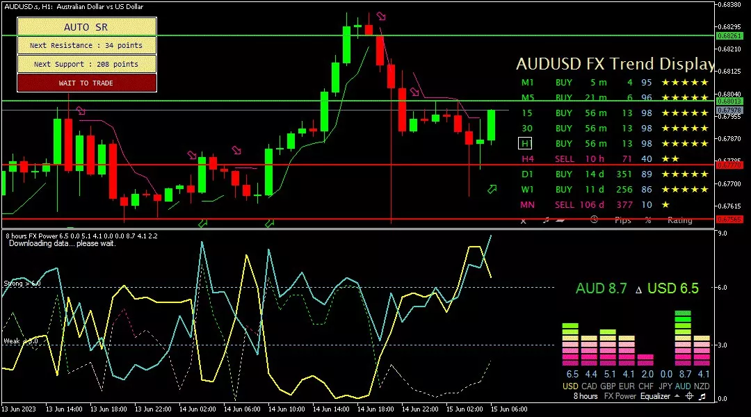 Analisa harian teknikal untuk pair AUD/USD pada periode 1 jam mencoba bergerak naik, menyentuh level resistance di 0.68100 hingga menuju level resistance selanjutnya di 0.68670. Tren kenaikan juga terlihat dari template FXBot, dimana angka AUD lebih tinggi sebesar 8,7 dari angka USD sebesar 6,5. Sementara bias bullish juga didukung oleh sinyal buy yang ditunjukkan dengan tanda panah hijau.