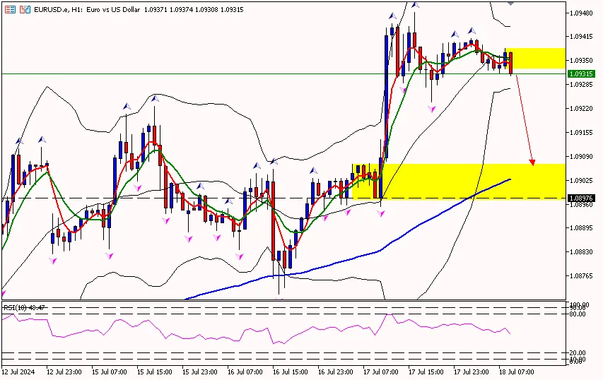 EUR/USD pada periode 1 jam berada di bawah area resistance pertama di 1.09460, mencoba untuk bergerak turun ke area pivot di 1.09200 hingga menuju support pertama di 1.08920. Sementara indicator RSI berada di bawah area pivot, sehingga euro berpotensi untuk bergerak turun lebih lanjut.