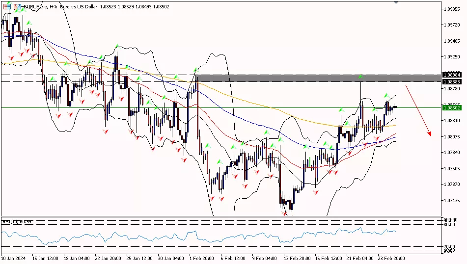 EUR/USD pada periode 4 jam berada di atas area pivot 1.08390, mencoba untuk naik ke area resistance pertama di 1.08650 hingga menuju resistance kedua di 1.08860. Sementara indicator RSI berada di atas area pivot, sehingga euro berpotensi untuk bergerak naik lebih lanjut.