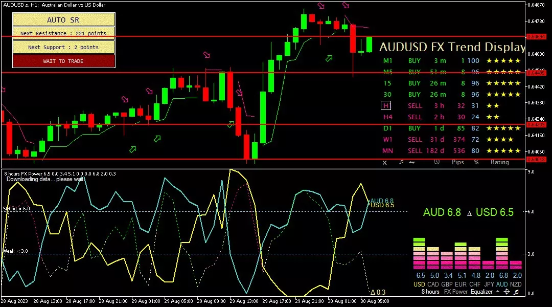 AUD/USD pada periode 1 jam mencoba bergerak turun, menyentuh level support di 0.64470 hingga menuju level support selanjutnya di 0.64090. Namun, tren penurunan belum didukung dari template FXBot, dimana angka AUD lebih tinggi sebesar 6,8 dari angka USD yang sebesar 6,5. Sementara bias bearish juga didukung oleh sinyal sell yang ditunjukkan dengan tanda panah merah.
