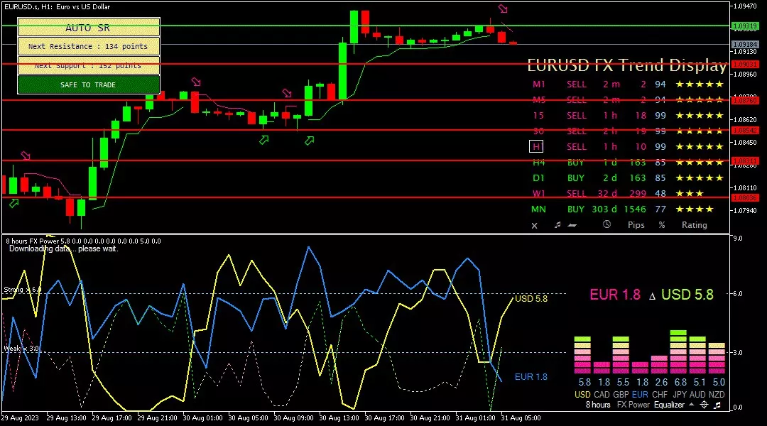 EUR/USD pada periode 1 jam mencoba bergerak turun, menyentuh level support di 1.08990 hingga menuju level support selanjutnya di 1.08540. Tren penurunan juga terlihat dari template FXBot, dimana angka EUR lebih rendah sebesar 1,8 dari angka USD yang sebesar 5,8. Sementara bias bearish juga didukung oleh sinyal sell yang ditunjukkan dengan tanda panah merah.
