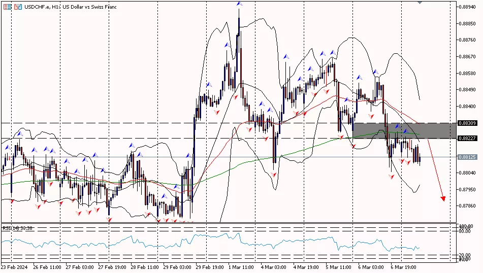USD/CHF pada periode 1 jam berada di bawah area pivot 0.88270, mencoba untuk turun ke area support pertama di 0.87980 hingga menuju support kedua di 0.87760. Sementara indicator RSI berada di bawah area pivot, sehingga mata uang franc Swiss berpotensi untuk bergerak turun lebih lanjut.