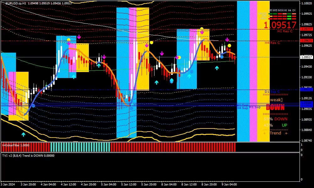 EUR/USD pada periode 1 jam mencoba bergerak turun, menyentuh level support di 1.09460 kembali hingga menuju level support selanjutnya di 1.09130. Tren penurunan juga terlihat dari template, dimana potensi persentase penurunan lebih tinggi dibandingkan dengan persentase kenaikan. Sementara bias bearish juga didukung oleh sinyal sell yang ditunjukkan dengan tanda panah ungu.