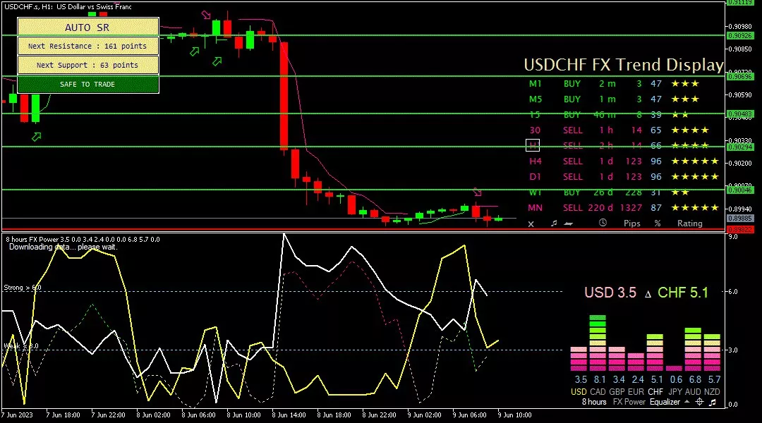 USD/CHF pada periode 1 jam mencoba bergerak turun, menyentuh level support di 0.89850 hingga menuju level support selanjutnya di 0.89280. Tren penurunan juga terlihat dari template FXBot, dimana angka CHF lebih tinggi sebesar 5,1 dari angka USD sebesar 3,5. Sementara bias bearish juga didukung oleh sinyal sell yang ditunjukkan dengan tanda panah merah.
